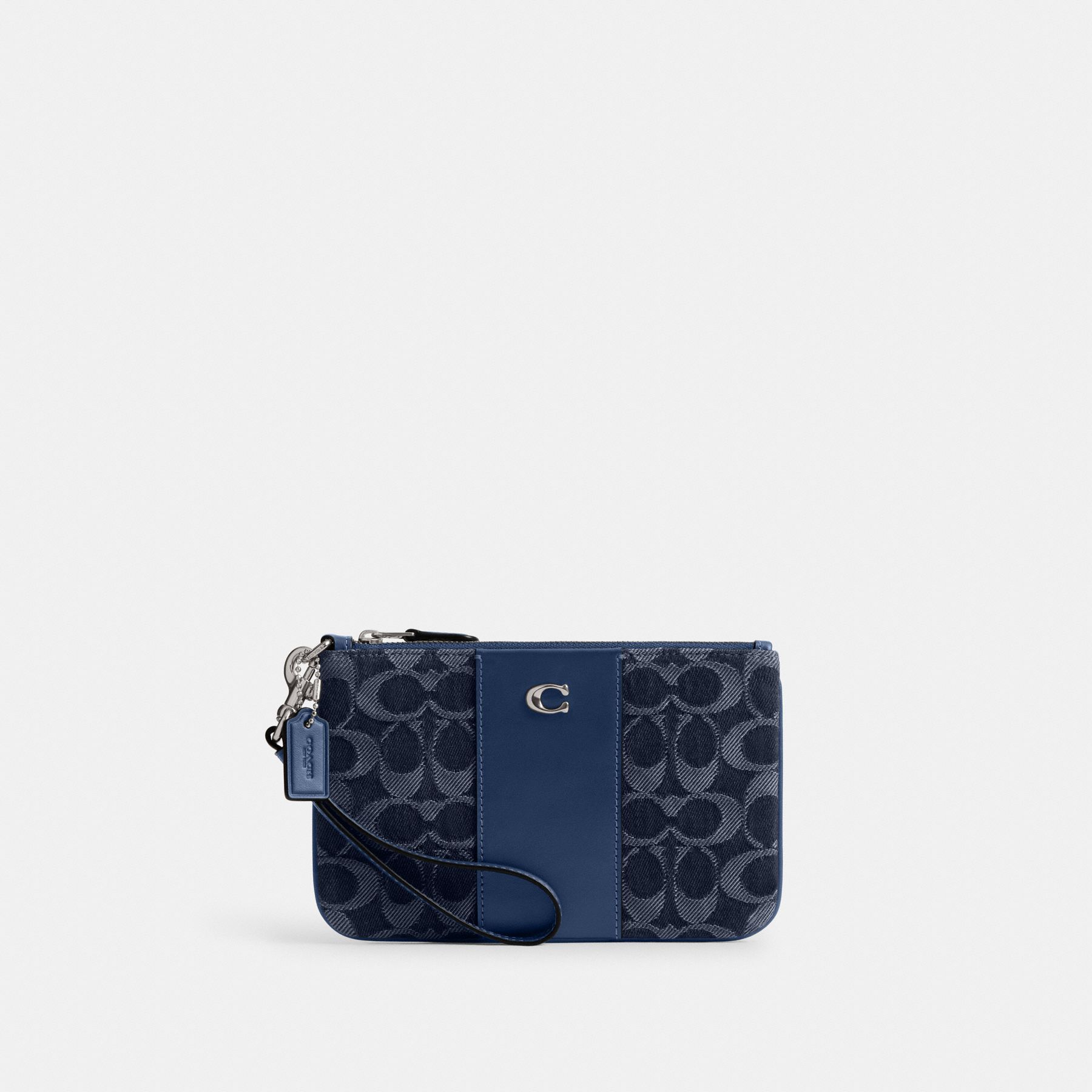 This Signature denim and refined leather wristlet is perfectly sized for cards, cash and a phone. Finished with our Signature hardware, wear it on your wrist or clip it inside a larger Coach bag.