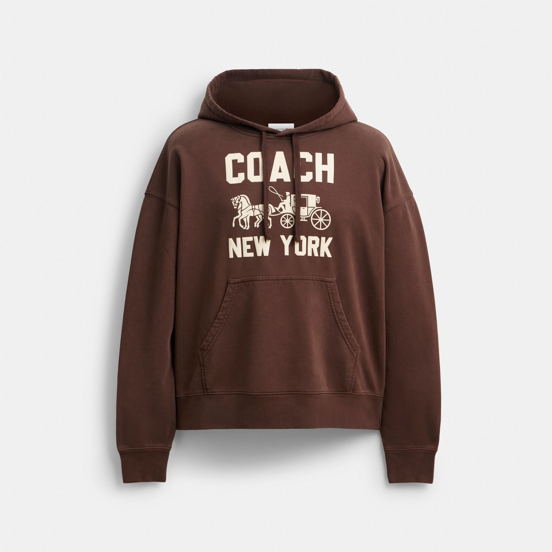 This relaxed-fit cotton sweatshirt is printed with a Coach graphic featuring our iconic Horse and Carriage motif. Garment-washed for a soft, lived-in feel, the hoodie is finished with a kangaroo pocket and ribbed trim.