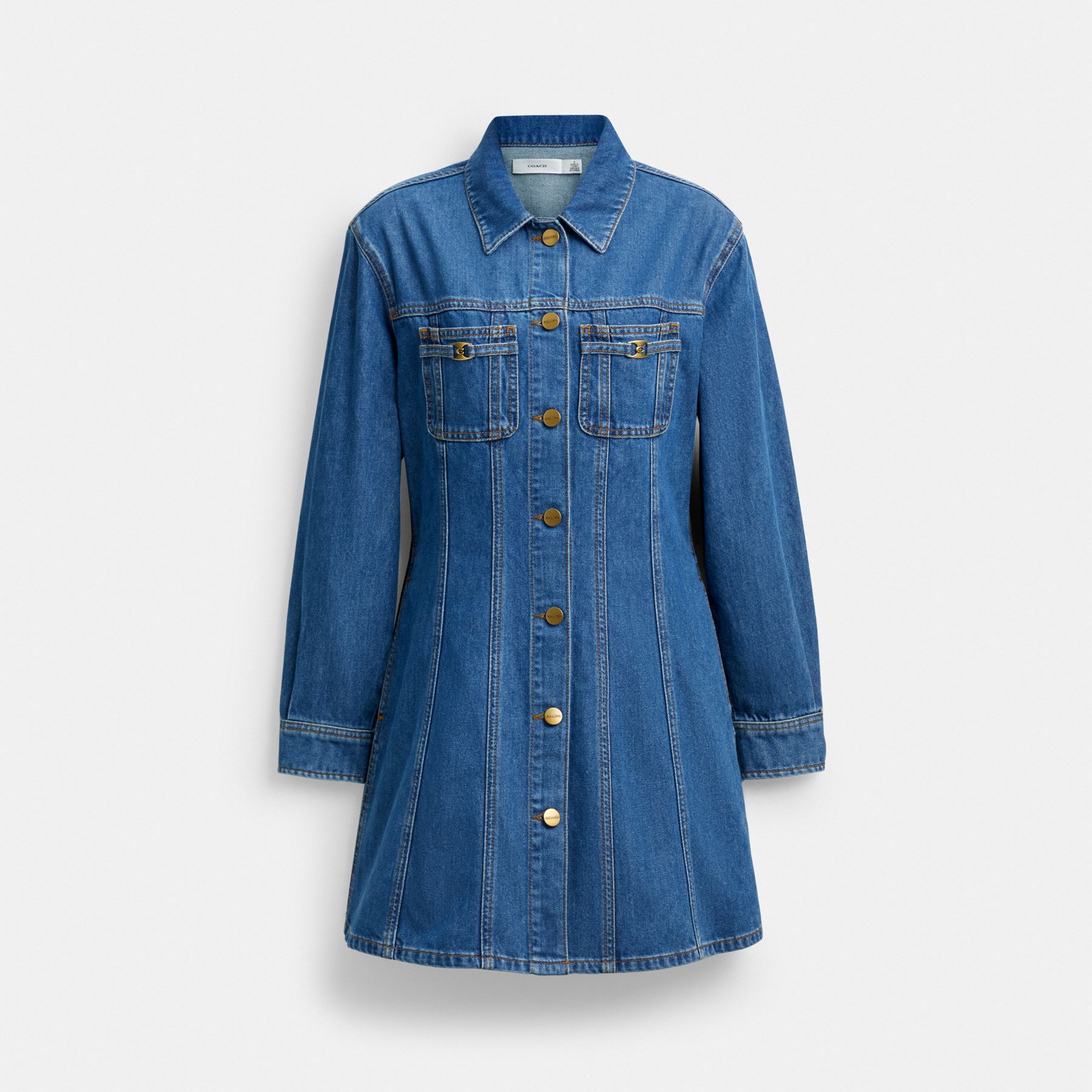 Inspired by classic trucker jackets, this denim dress features a pointed collar, button closures and buttoned flap chest pockets. Crafted of organic cotton made without the use of harmful chemicals and pesticides, the long-sleeve A-line silhouette is detailed with vertical seaming and finished with our Coach flag for a subtle heritage touch.