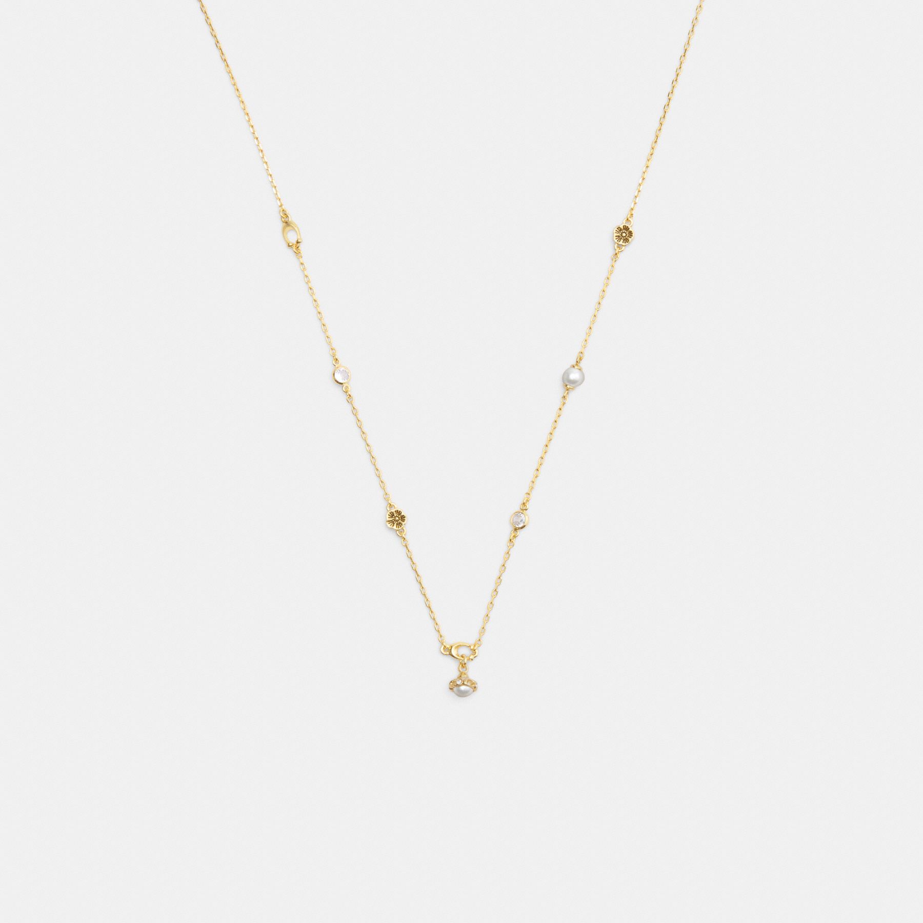 This delicate chain necklace features an array of iconic Coach motifs along with perfectly placed glass pearls and sparkling crystals. It’s finished with an adjustable clasp closure to wear long or short.