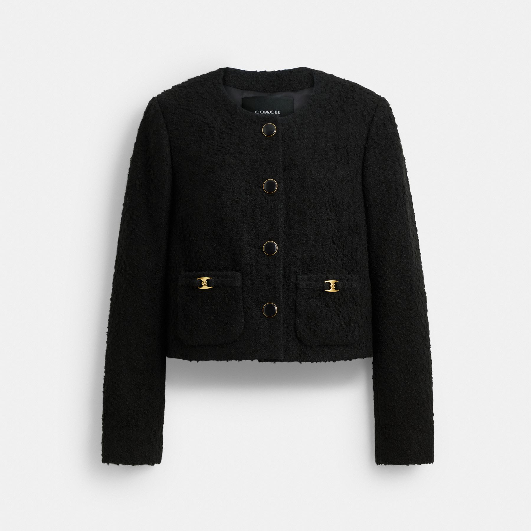 A modern take on a classic style, this jacket features patch pockets detailed with our Heritage C Plaque. Crafted of a lightweight cotton-blend boucle, the collarless design is finished with brass-rimmed buttons.
